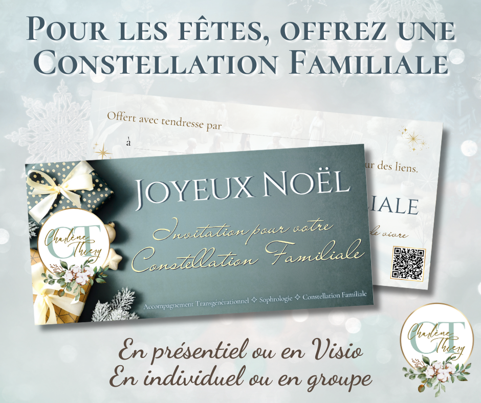 Ce bon cadeau permet de vivre une Constellation Familiale, en séance individuelle ou en groupe, en présentiel ou en visio, selon ce qui est le plus juste.