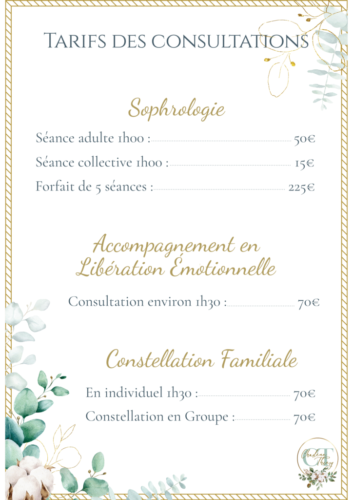 Tarifs applicables en 2025 Ces tarifs sont valables pour toutes les consultations effectuées entre le 1er janvier et le 31 décembre 2025.Toute évolution sera communiquée à l’avance sur cette page. Liste des mutuelles qui remboursent la Sophrologie
